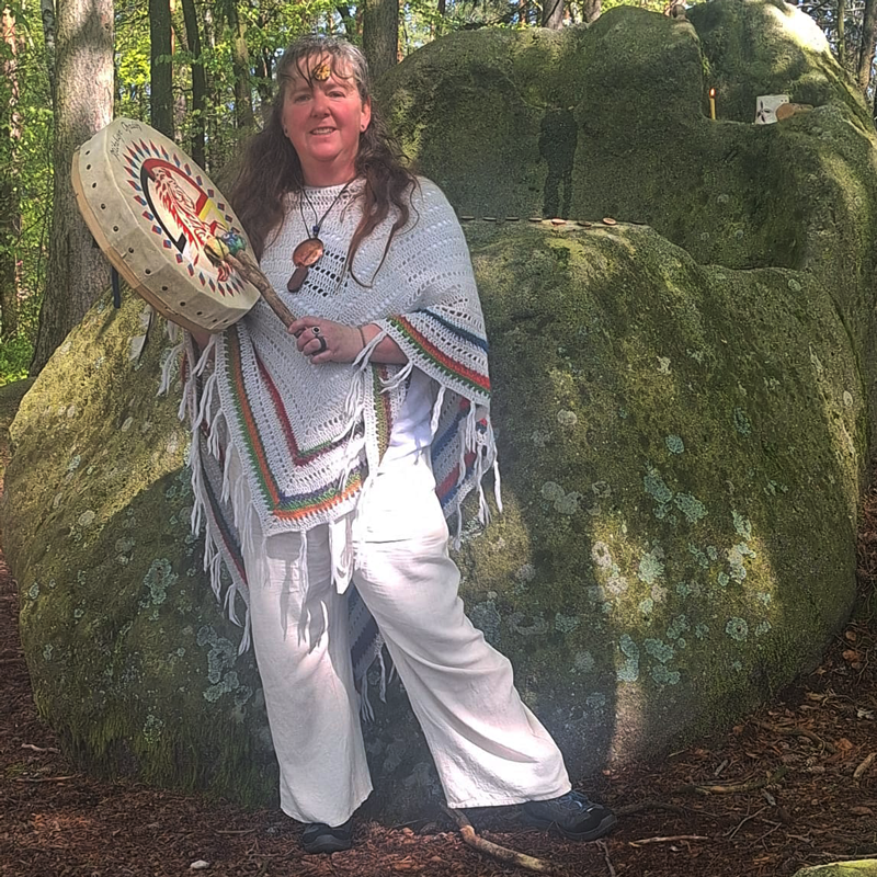 Ich bin Anja (IndiAnja) und dankbar, an der Erdheilungs-Zeremonie am 25. April 2026 mitwirken zu dürfen und auch sehr dankbar, dass mich mein Partner dabei unterstützt. Ich verstehe mich als Intuitive. Das Leben selbst hat mich ausgebildet – besonders die Geburten meiner Kinder waren tiefe Initiationen. 2017 fand ich durch einen heftigen Burnout zum Trommeln, erlebte mich dabei als Kanal für die Trommelschläge. Durch Begegnungen und Lehrerinnen vertiefte ich mein Wissen über schamanische Praktiken, Rituale und Zeremonien.